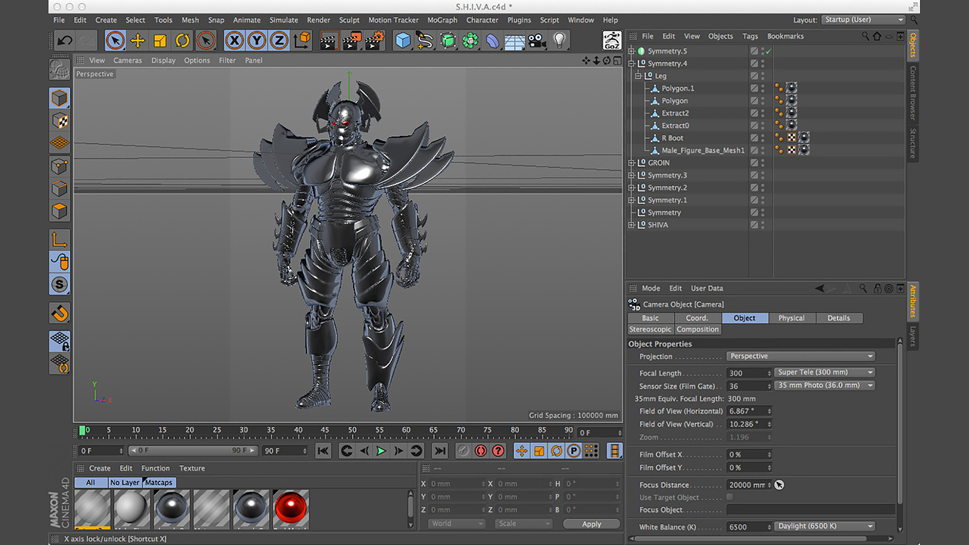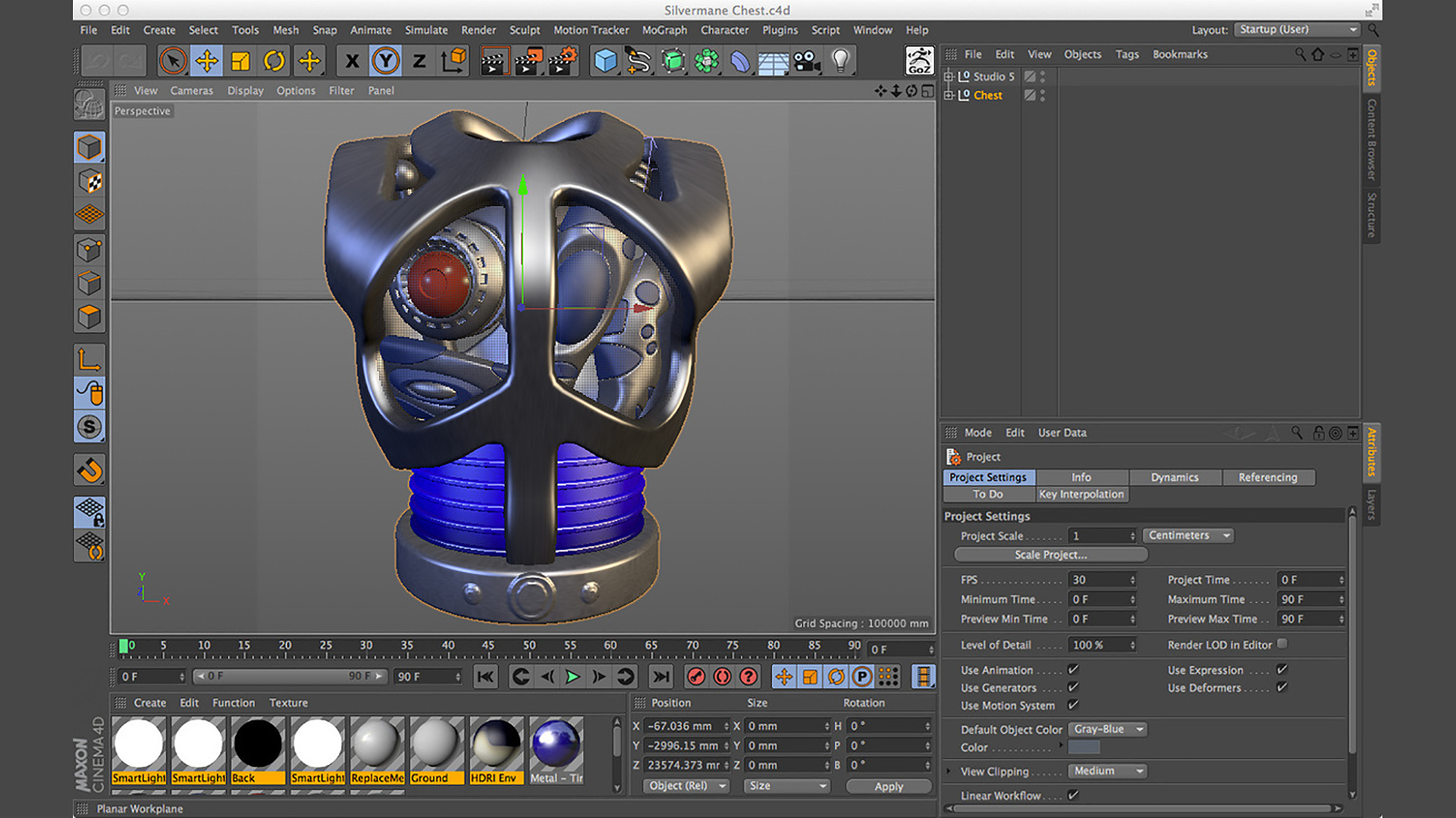 Für das Szenen-Setup und das Rendering greift Hopgood auf einige Studio-Lichtaufbauten zurück, die er von C4Depot zugekauft hat. „Das vom mir präferierte Setup besteht aus drei digitalen Lichtwannen und einem relativ abstrakten HDR-Bild das auf ein Himmelsobjekt gemappt wurde. Speziell die metallischen Materialien ergeben mit diesem Setup gute Resultate beim Rendern. Dabei verwende ich Globale Illumination und in den Einstellungen des Physikalischen Renderers setze ich die Option ‚Objekt Visualisierung Hoch‘“.