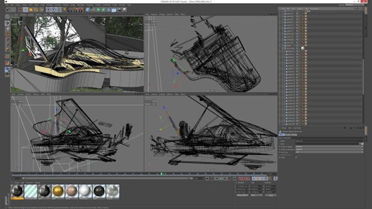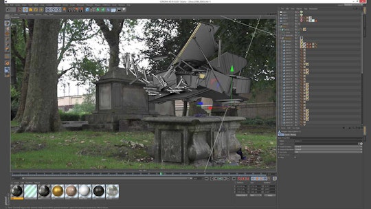 Much of the work done in CINEMA 4D was done using the MoGraph feature, which was used to animate the numerous object fragments floating in the scene. Hair and spline dynamics as well as Thinking Particles, and almost all Deformer objects were used to really put things in motion. Features not offered by CINEMA 4D were simply created via plugins such as Thrausi, for example.