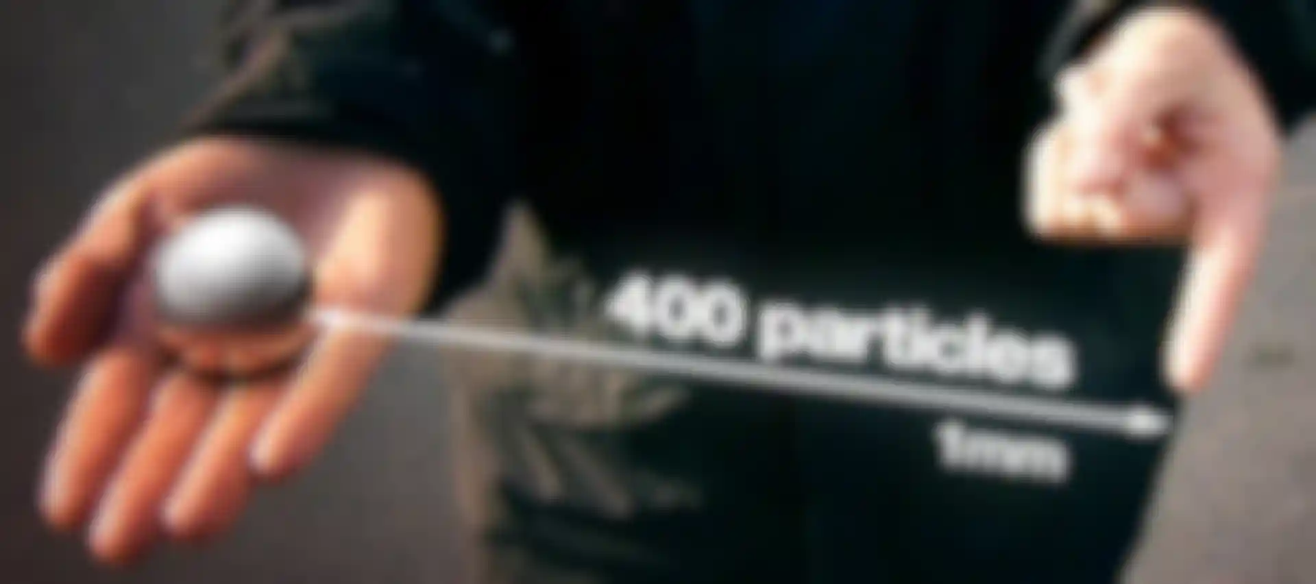 La primera parte de la secuencia se creó usando imágenes de una sola esfera que representaba una partícula de PM2.5, y un solo grano de arena volaba a enormes proporciones. Para crear la reflexión necesaria para posicionar la esfera en la mano, Sophia añadió un objeto piso debajo de la esfera y se asignó el vídeo que usó de proyección frontal; la esfera entonces reflejaba la mano y su entorno perfectamente. El grano de gran tamaño de la arena es sólo un objeto básico desplazados mediante la función Ruido en Cinema 4D.