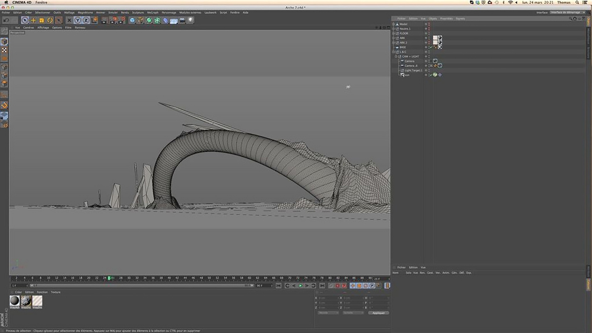 "Dans l'ensemble, je dois reconnaitre que que "The Ark" n'est pas une scène extrêmement complexe," déclare Thomas. "Le seul problème que j'ai rencontré est survenu au moment ou j'ai voulu effectuer le rendu de la scène. Etant donné que l'image devait être calculée à une très haute résolution, les temps de rendu se sont avérés être tout simplement exorbitants lorsque j'ai fait les premiers tests. La texture de type déplacement haute-résolution de l'arc s'est avérée la principale responsable quant à ce gonflement démesuré des temps de rendu ! C'est pourquoi j'ai opté en fin de compte pour un rendu séparé de l'arc et des structures pour ensuite composer et ajuster finement ces deux éléments dans Photoshop." Le résultat parle de lui-même et prouve par l'exemple de l'excellence avec laquelle Thomas est à-même de créer des images spectaculaires à partir des ses visions futuristes en utilisant Cinema 4D.