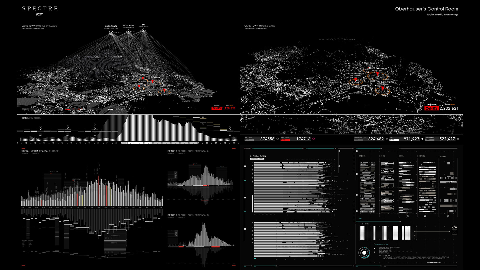 “L'un des décors les plus imposants pour lequel il a fallu produire des animations a sans nul doute été le repère de Oberhauser, ce dernier nécessitant plus de 120 écrans ! J'ai réalisé ces animations afin qu'elles puissent être disposées en lignes et ainsi s'intégrer parfaitement aux longs couloirs et aux rangées de postes de travail.”