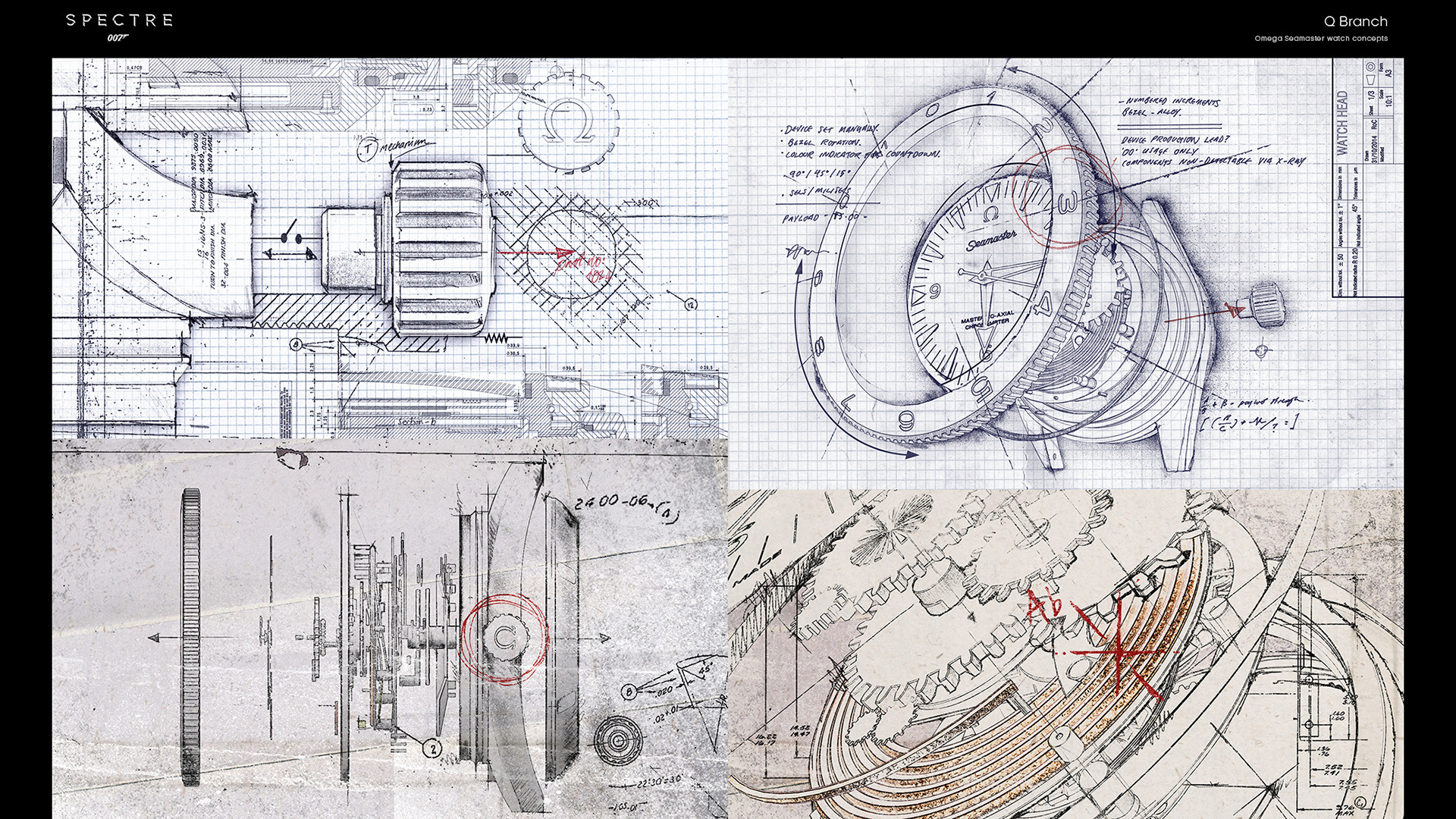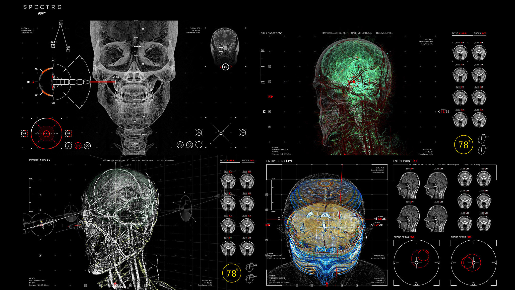Les écrans utilisés dans 007 Spectre ont été créés à partir d'images 3D et de synthèse. Environ 90% de ces écrans ont été créés avec Cinema 4D et After Effects (pour certaines animations et compositions 2D). « Nous avons utilisé Cinema 4D pour de nombreuses animations, dans la mesure où il est plus rapide de les créer avec MoGraph qu'avec After Effects. Cela s'est avéré particulièrement utile lors de la conception de l'environnement de développement modulaire pour la division Q et du langage graphique libre du repère de Oberhauser. »