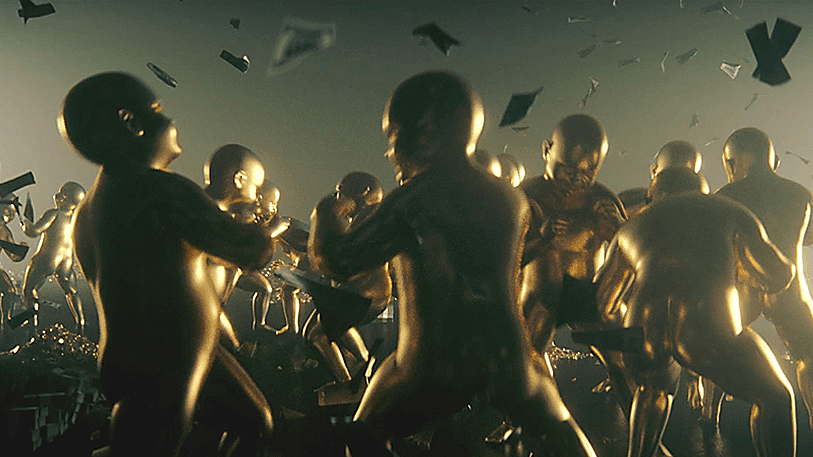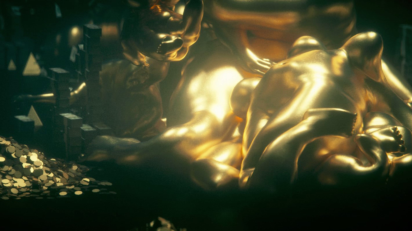 MW: Oh, sì, ho usato Houdini per la folla dorata che si scioglie. Non ho idea di come ho fatto! Quando ho iniziato questo lavoro, quattro anni fa, era la prima volta che creavo dei personaggi. Ho usato Mixamo per il grosso personaggio dorato, e Houdini per l'effetto di fusione. Meno male che avevo salvato un file Alembic, altrimenti avrei dovuto ricominciare da capo, perché non ricordo come l'ho fatto. Tutti i combattimenti li ho fatti con i modelli Mixamo già messi in posa, come se stessero colpendo, schivando o prendendosi a pugni. Dovevo solo coreografare i personaggi per simulare la lotta. Sono contento del risultato.
