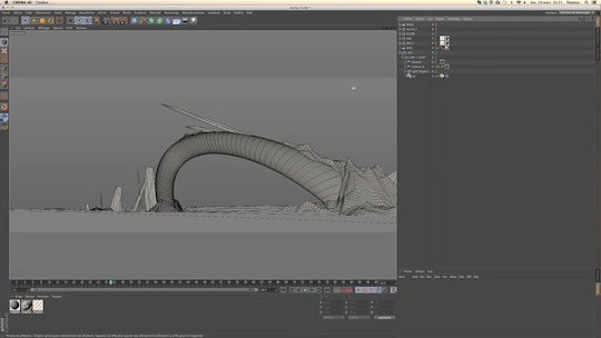 Poi ha creato un'altra mappa di spostamento in Cinema 4D, con caratteristiche di disturbo e distorsione, renderizzando l'arco con V-Ray per creare un'imponente struttura in pietra ad arco. In seguito ha creato le strutture che pendono come nidi di rondine lungo l'arco, anche questi creati con Cinema 4D. La funzione MoGraph di Cinema 4D è stato utilizzata per duplicare e distribuire questi oggetti.