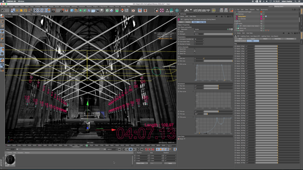 E' stato usato inoltre un altro plugin proprietario per animare i giochi di luce, allo scopo di controllare l'animazione basata su nodi. Il vantaggio principale è stato quello di poter attivare la complessa animazione ondulatoria delle luci tramite la decadenza di un solo Effettuatore MoGraph animato. Questo ha eliminato la necessità di creare dei keyframe per ciascun riflettore.