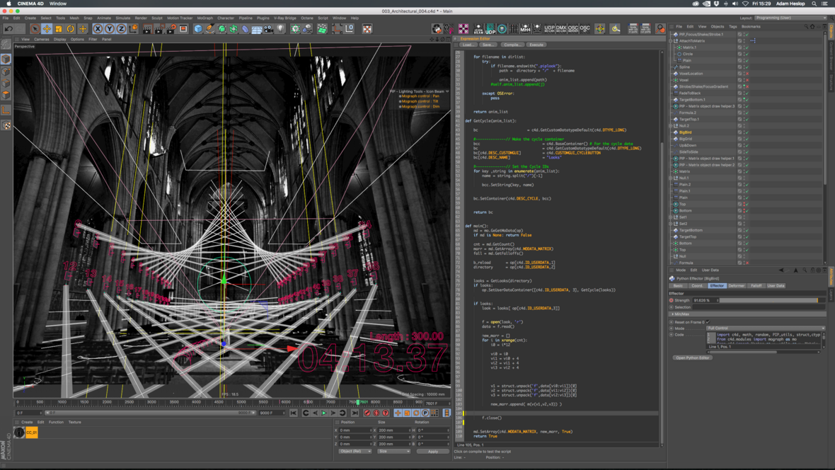 Ogni riflettore inoltre aveva una propria posizione nello spazio ed un proprio target specifico. Non appena il target si spostava, veniva attivata la corrispondente rotazione del riflettore. Come target dei riflettori sono state usate le matrici di MoGraph, che potevano essere facilmente influenzate dagli Effettuatori MoGraph. Ma MoGraph non solo permetteva di influenzare i parametri dei riflettori: permetteva anche di controllarli in gruppo. Questo ha semplificato enormemente il workflow, come spiega Adam: "Essere in grado di modulare nello spazio gruppi di oggetti (nel nostro caso, le matrici dei cloni target delle luci) attraverso i settaggi base degli effettuatori, consente di generare velocemente effetti e forme architettoniche".