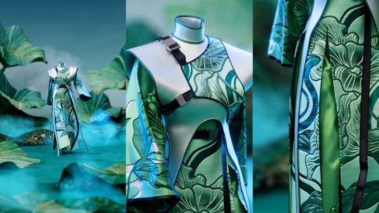 Fungはこれらのデジタル衣装を異なる世界に持ち込む際の課題を考慮する必要がありました。「私の衣装は有機的な形をしているため、多くのポリゴンを含んでいます。XR用の計画の一部は、これらをデジタルワールドで機能するように最適化することでした」と彼女は説明します。唯一の黄龍はフィジタルとしてデザインされ、Phygital Twinと共同で物理的なガーメントに変換するための追加作業が必要でした。「デジタルファッションは、物理的なガーメントほど機能的や実用的である必要はありませんので、デジタルガーメントは物理的なピースとして機能する前に修正が必要になることがあります」と彼女は説明します。この場合、パターンカッターがデジタルパターンを実際に製造できるものに再設計しました。