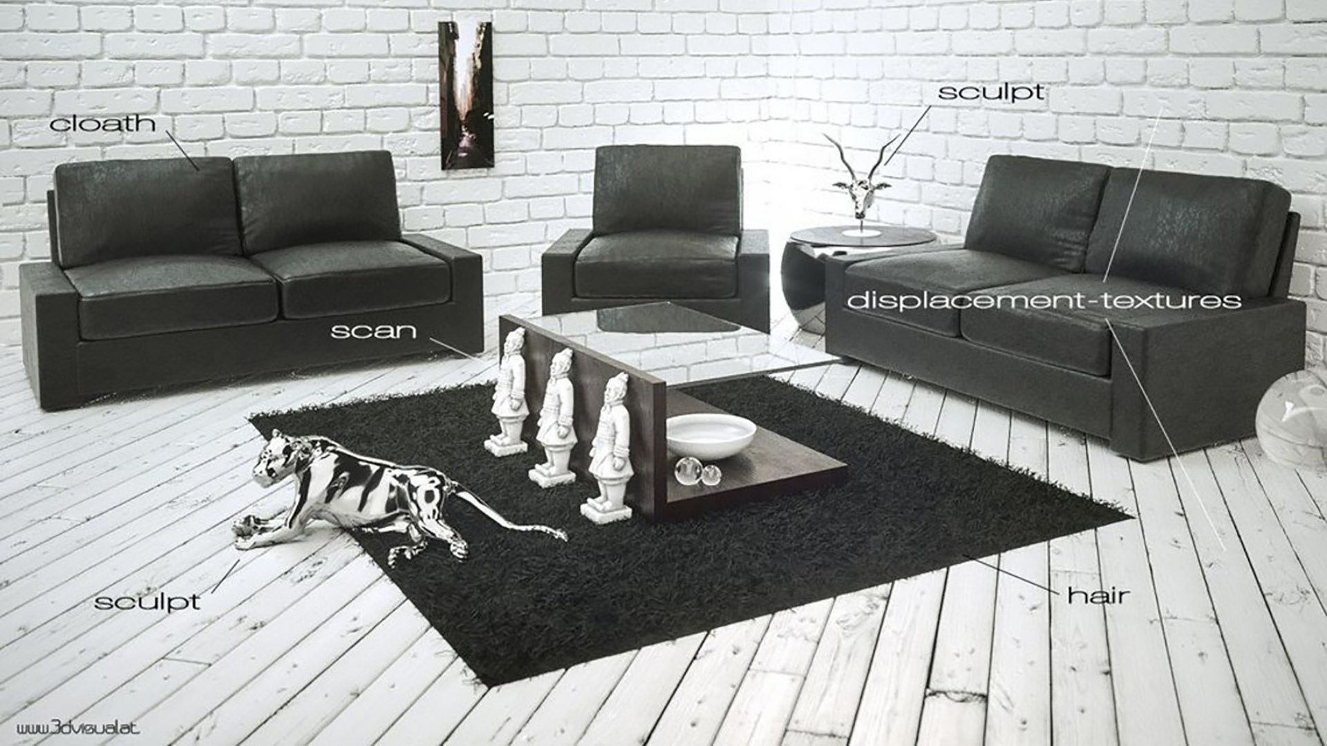 家具のモデリングした後は、スカルプトとテクスチャ設定してからシーンに配置します。クリストファーは、レンダリングにOctane レンダーエンジンを使っています。OctaneはGPUレンダラーで、コンピュータのグラフィックカードを使うことで非常に高速なレンダリングができます。Octaneはアンバイアスなレンダラーで、ライティングやサーフェイスの特性を正確にレンダリングでき、レンダリング結果もとても印象的に仕上がります。