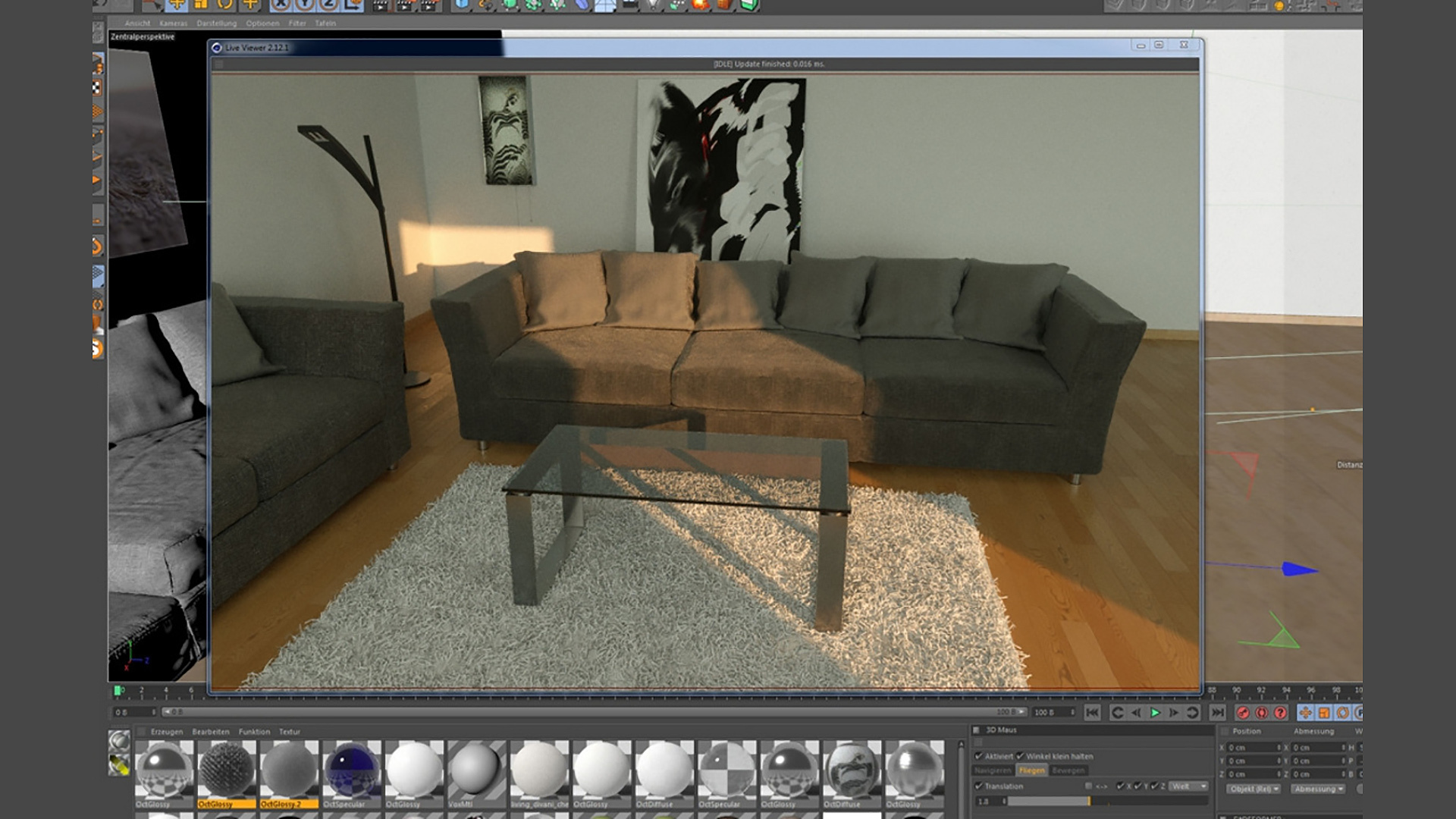 彼が、360種類のソファを60種類の異なるバーチャルショールームでのビジュアライゼーションを仕事がクライアントから依頼された場合、すぐにCinema 4Dでそれにあったワークフローを開発します。これにより、彼は求められた品質、納期と予算で提供できるのです。