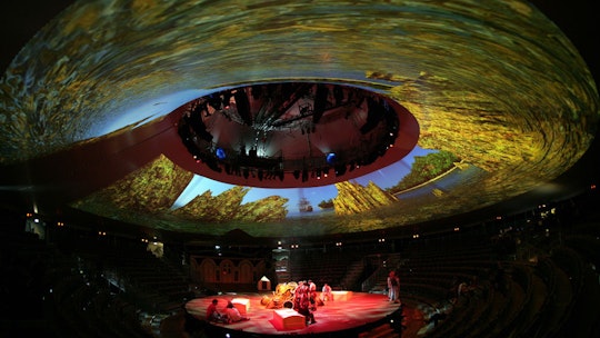 The stage production relies heavily on a custom-built tent designed by Teresa Hoskyns, whose architectural design credits include Cirque Du Soleil. Featuring seating for 1,350 persons, the 99% light-tight structure is suspended by external girders, affording every member of the audience a fully unobstructed view of the stage, which includes the center pavilion as well as its upper walls. The walls serve as a gigantic surround projection screen, bringing projected 360-degree CGI imagery to live theater audiences for the first time.