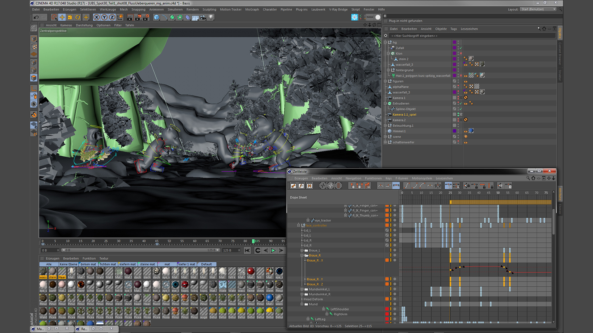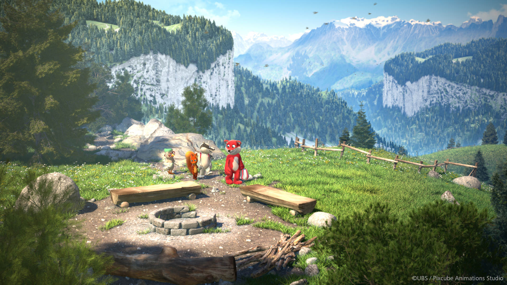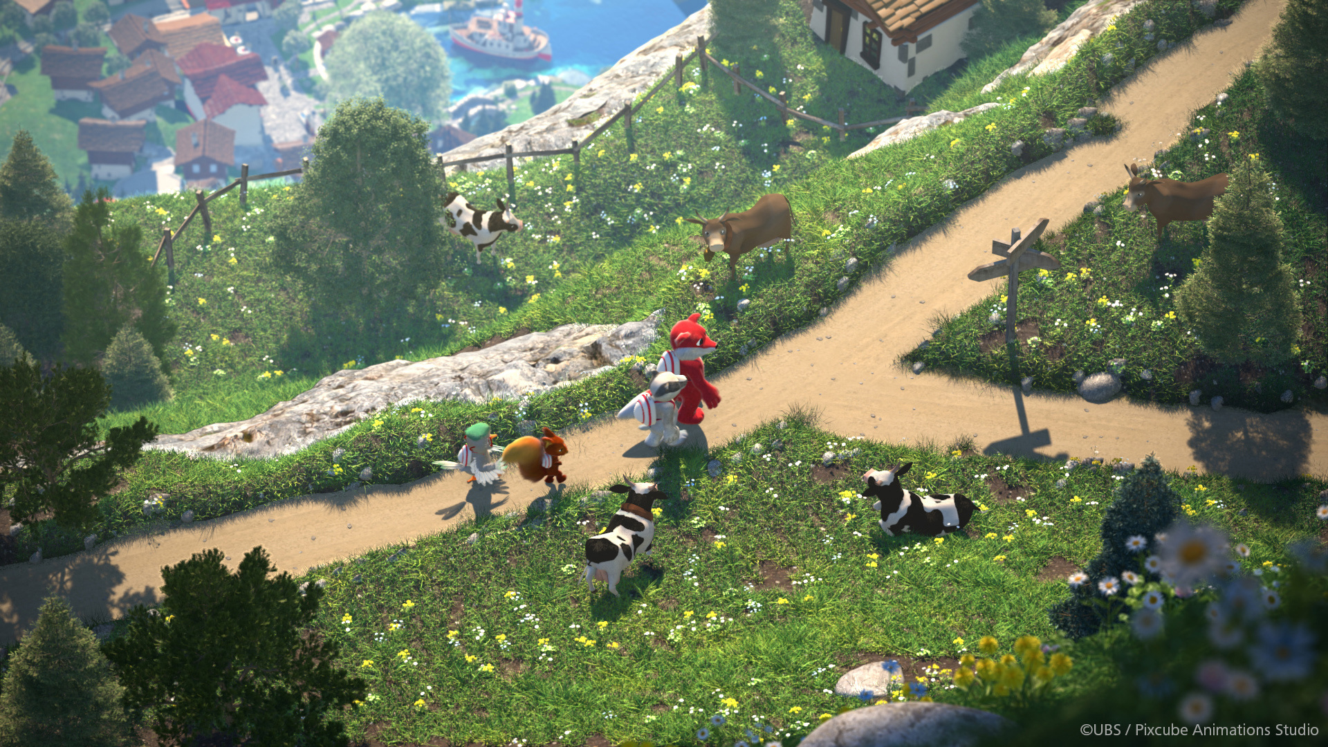 In addition to all the characters, the surrounding scenery also had to be created, which had to be created in a characteristic “Swiss” look. This meant that mountains, slopes, forests and the characteristic houses and structures also had to be modeled in Cinema 4D. “We made quite liberal use of the MoGraph tools for the creation of the landscapes. Cloner objects, Effectors and render instances were essential elements for this phase. We used the Laubwerk plugin to create most of the vegetation and the Hair feature in Cinema 4D when it came to creating grasslands and pastures.”