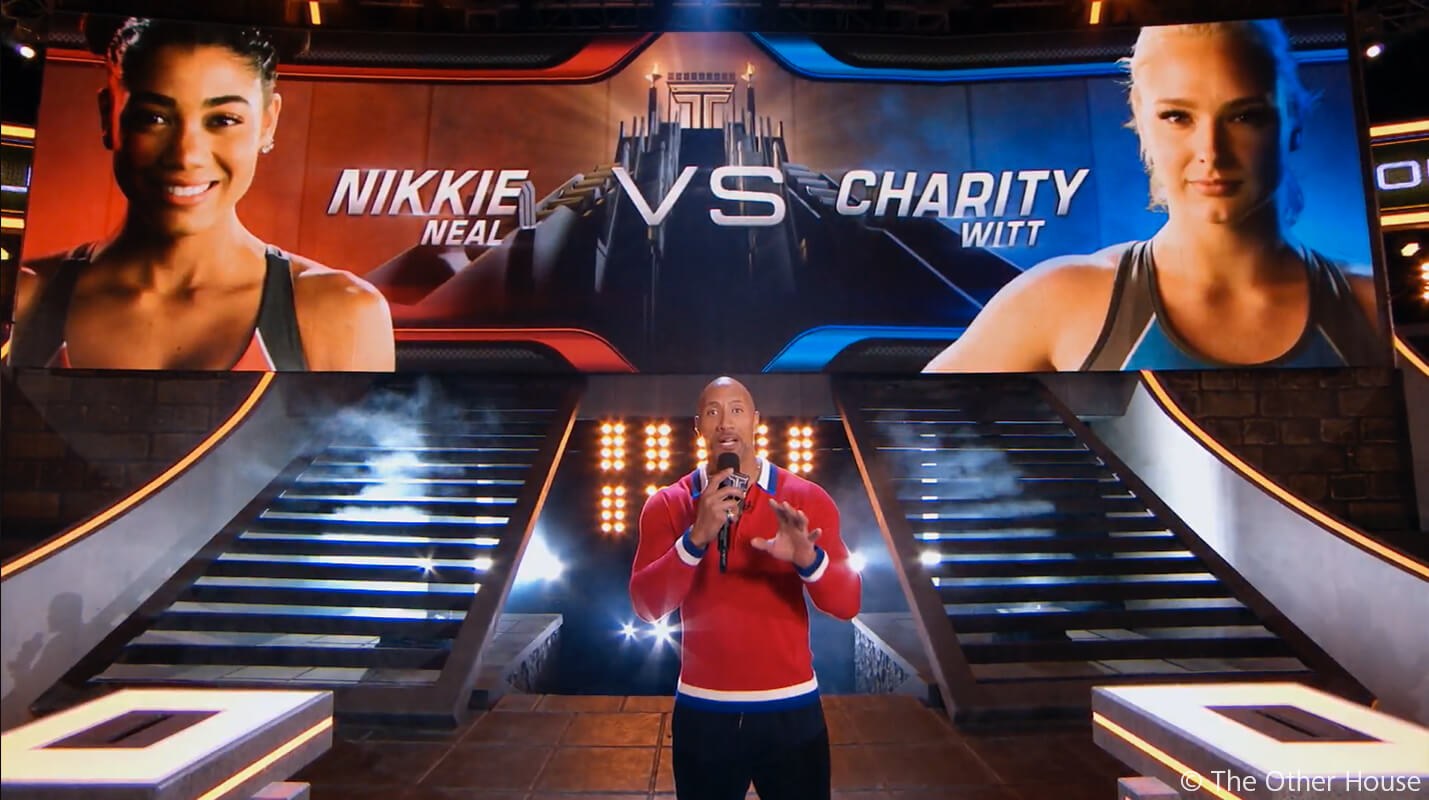Based on Johnson's desire to push everyday athletes to reach their full potential, The Titan Games, offers competitors a chance to step into the Titan arena and tackle mental and physical challenges designed by Johnson. Branding the series was tricky for many reasons, Roth recalls. Because the series was still in development when The Other House began creating design options, his team's work needed to evolve along with the show. Early ideas were inspired primarily by traditional sports graphics. But that American Ninja Warriors' sports sensibility didn't quite fit as the arena took on more of an epic Roman colosseum fantasy look. Set development mixed things up even more with a variety of high-tech feature revisions that introduced a Tron-like futuristic vibe.