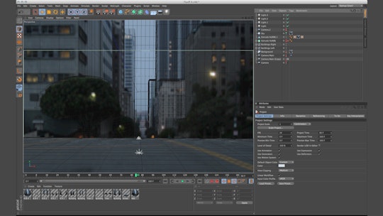 실제적인 도시를 만들기 위하여, Balcomb은 어느 일요일 새벽 5시에 LA의 도심으로 향했습니다. 적어도 LA 처럼 보이는 거리에서 카메라와 삼각대를 설치하고 수백장의 사진을 찍었습니다. Cinema 4D를 사용하여 일부 건물을 수정하고 다른 것들을 추가한 다음, 빌딩의 개략적인 지오메트리를 생성하고, 카메라가 움직일 때 사실적인 시각차(parallax)를 얻기 위하여 그가 촬영한 스틸 사진들을 그 지오메트리 위에 카메라 맵핑시켰습니다.