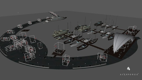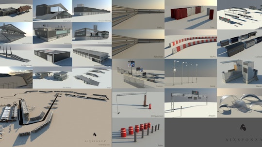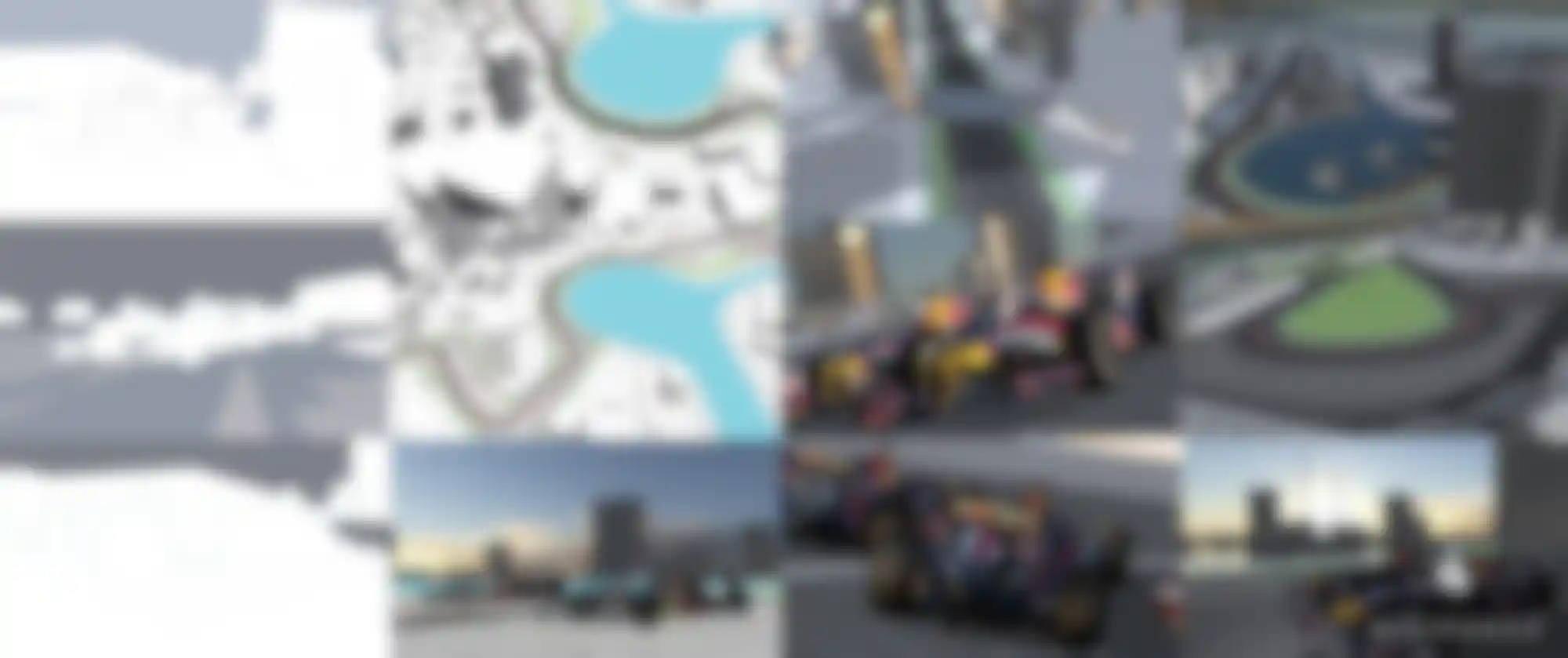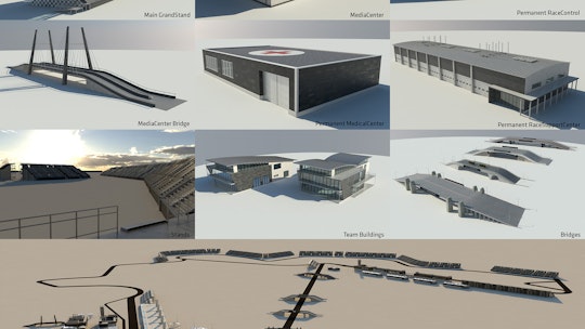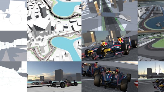 While some elements only had to be touched up, the majority of the elements in the animation had to be built from scratch. This included all track buildings, the skyscraper and a fully occupied yacht harbor dubbed "The Marina". A lot of attention was given to the marina because it would be included in several close-ups. The marina turned out to be the greatest single asset in the animation, weighing in at about 4 million polygons and a texture load of around 2 GB!
