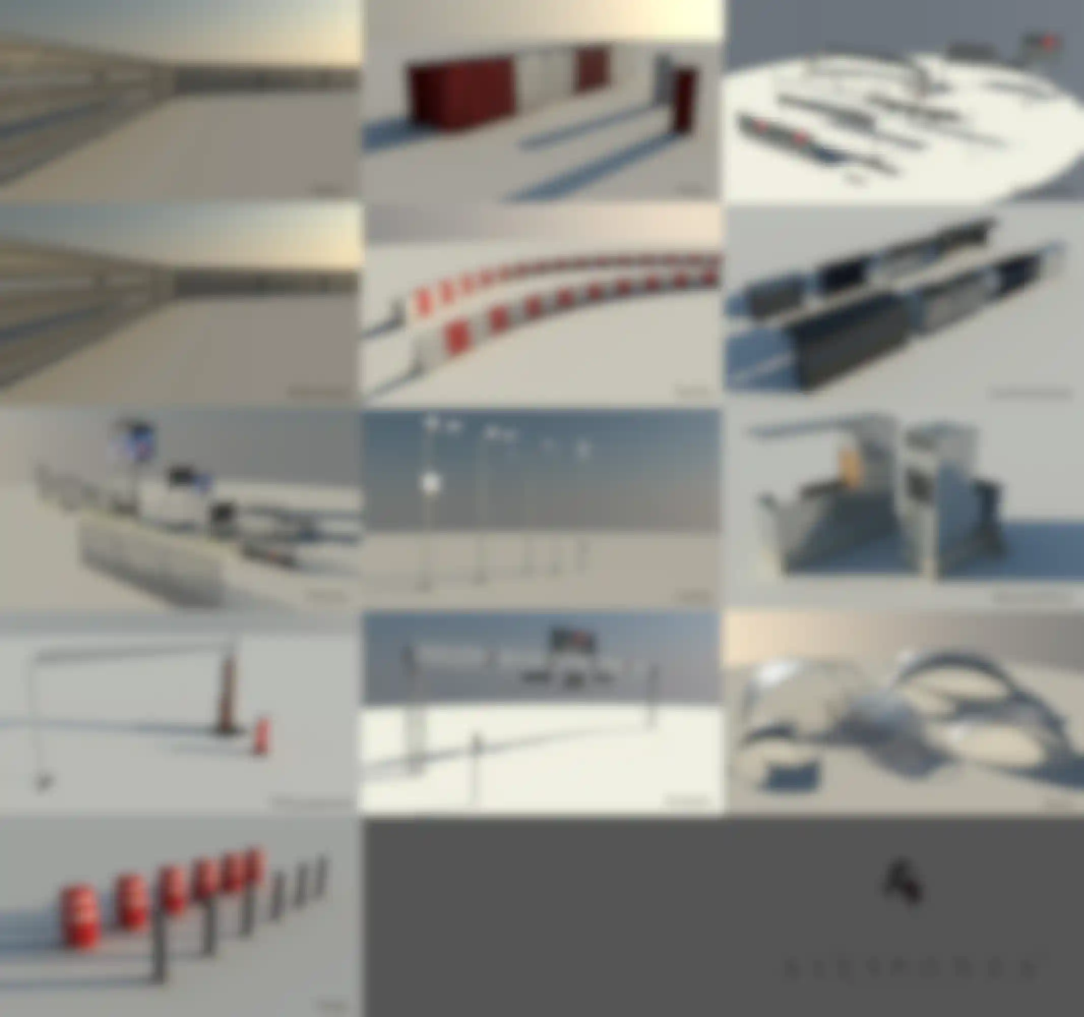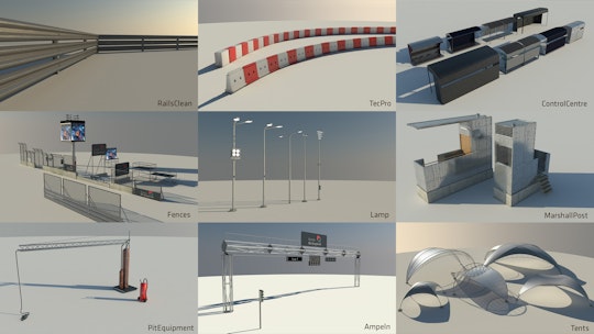 We did, however, have to build the racetrack and all accompanying elements from scratch. After reviewing existing assets such as tire barriers, guardrails, fences, lampposts, etc., we determined that they no longer met our quality standards. These had been created about three years earlier and it was easy to see that our texturing and shading standards had risen sharply since. It was decided to create all of these assets anew to make them meet our expectations. This included re-modeling all assets, except for the racing cars (these were CAD objects), using a basic polygon modeling technique. Primary emphasis was put on updating shaders to include advanced features such as sub-surface scattering (SSS) on the TecPro plastic rails. We were not able to use SSS in the past because of the increased render times it required. Dirt and grime were also added to the shader for more realism.