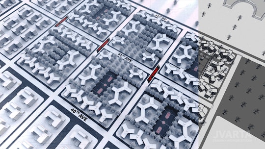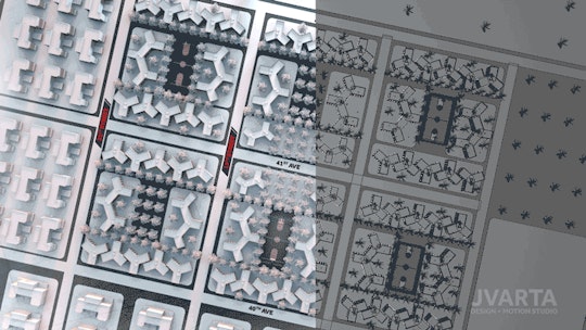 J.V.: Their team shot a lot of footage on the street and using drones. We referenced that and Google Maps to make sure we had all of the buildings in the right place. The Queensbridge housing projects are in a very concentrated area in New York, and the buildings look the same. To get the stylized look we wanted, we used Cinema 4D to make the buildings from scratch. We made three versions of the buildings and we cloned them and rotated them correctly. Having three main pieces and instancing 30 other buildings definitely helped our workflow. We also used Cinema 4D’s content browser for objects like the trees.